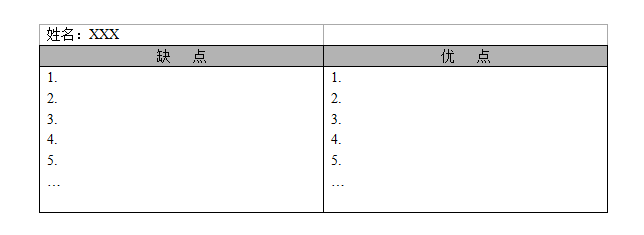 - 第四步,從今天開始,你開始“強(qiáng)迫”自己每一天或每一次見到他時,必須從他身上找到一個或一個以上的優(yōu)點,并記錄在左邊“優(yōu)點”欄中,這個過程要求持續(xù)21天或21次以上,直到習(xí)慣。下來,是游戲效力的關(guān)鍵步驟之一。不要試圖偷懶,僅憑腦袋記憶。如果公憑記憶行事,將太容易使你半途而廢了。